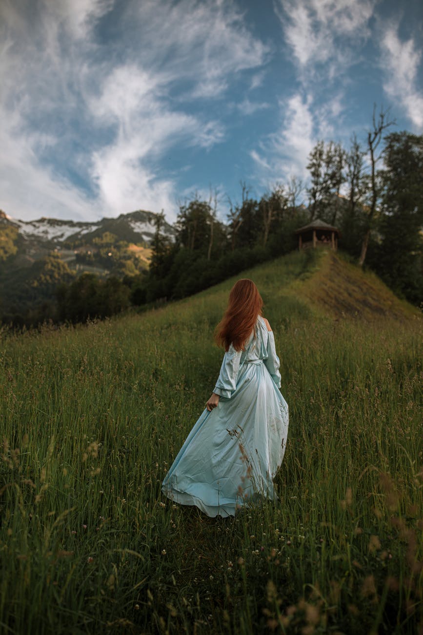I hold the bottom of my flowy dress up with both hands as I’m running in slow motion,